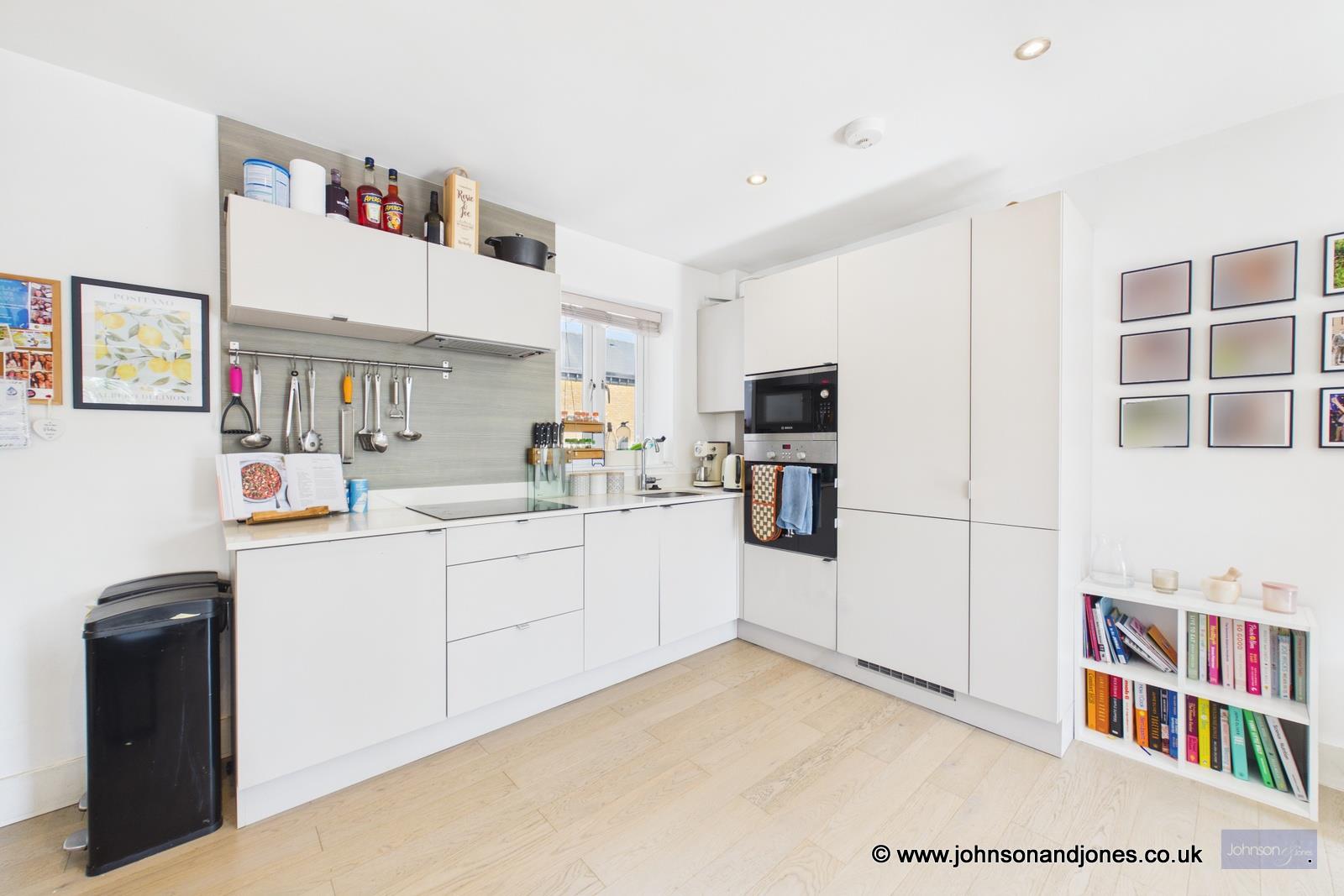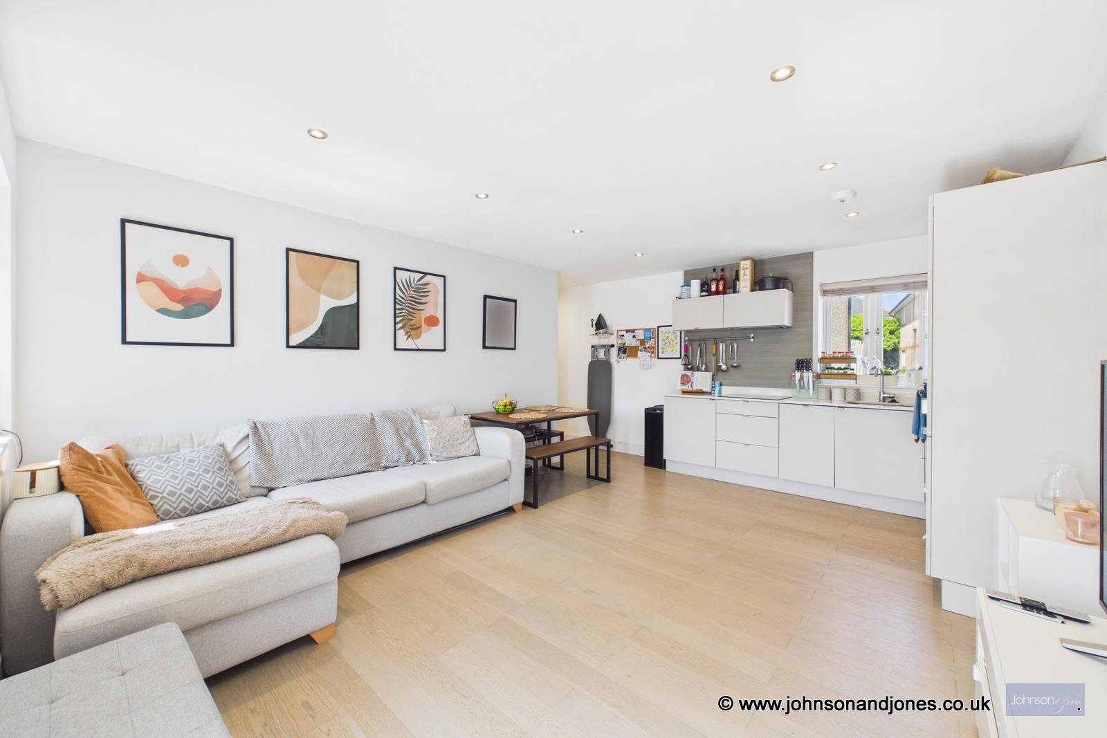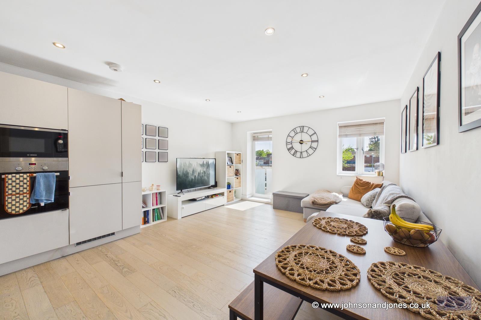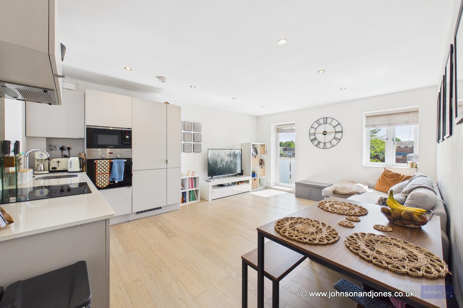 Presented to the market in immaculate condition, this sophisticated two-bedroom apartment offers a masterclass in modern living. Though constructed in 2017, the residence has been maintained to such an exacting standard that it retains the pristine feel of a brand-new home. Upon entering, the quality of the finish is immediately striking, characterized by elegant engineered wood flooring that flows seamlessly through the primary living spaces, complemented by plush carpets in the bedrooms and artisan tiling in the bathrooms.The heart of the home is a magnificent open-plan kitchen, living, and dining area, designed to accommodate both quiet relaxation and vibrant entertaining. This expansive space features a bespoke, British-made kitchen equipped with premium integrated appliances, leaving ample room for a substantial seating arrangement and a full-sized dining table. Floor-to-ceiling glass leads out to a private, glass-fronted balcony, providing an effortless extension of the living space.Both bedrooms are generously proportioned doubles, each featuring custom-built-in wardrobes. The principal suite is a luxurious retreat, boasting a stunning en-suite shower room finished with contemporary chrome fixtures. The primary family bathroom mirrors this high design standard, offering a refined suite with a shower over the bath.Practicality is woven into the lifestyle here, with secure gated underground parking, a communal cycle store, and a tranquil enclosed rear garden for residents. The property further benefits from double-glazed windows and low-voltage LED lighting throughout. Notably, the home stays perfectly temperate via gas underfloor heating, the cost of which is conveniently included within the service charges, ensuring comfort and peace of mind in equal measure.Service Charge: Approx. £2,319 Per AnnumGround Rent: £250 Per AnnumLease Length: 116 Years Remaining